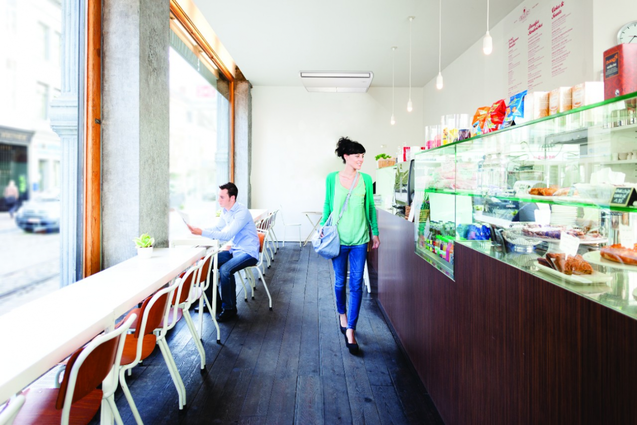 Nagyteljesítményű mennyezetre függesztett egység kiskereskedelmi és ipari alkalmazásokhoz. Álmennyezet vagy szabad padlóterület nélküli helyiségekbe javasolt.